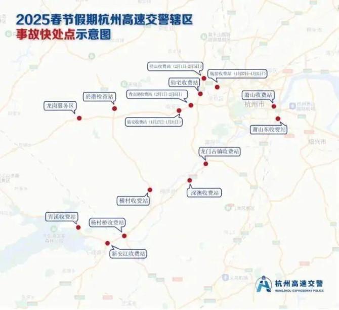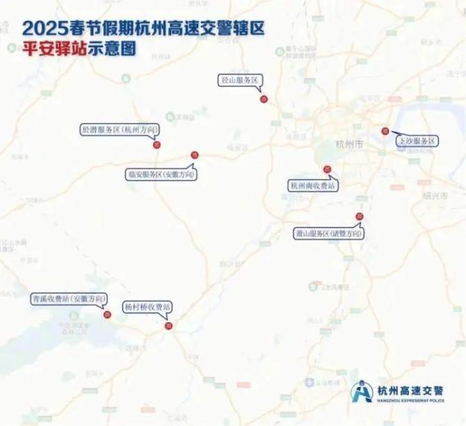 春节假期返程期间,辖区各服务区、收费站都会出现车辆饱和情况,其中临安服务区、龙岗服务区、建德服务区、桐庐服务区4个服务区,杭州西收费站、新萧山收费站、萧山城区收费站、新街收费站、紫金港收费站、杭州南收费站、新杭州收费站、南庄兜收费站8个收费站容易饱和甚至出现排队倒灌至主线现象。